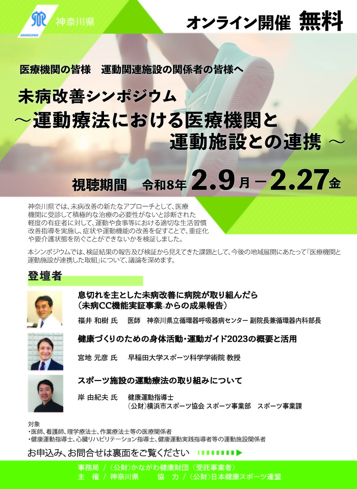 | プログラム | (講演1) 息切れを主とした未病改善に病院が取り組んだら (未病CC機能実証事業からの成果報告) 講師:神奈川県立循環器呼吸器病センター 福井 和樹氏 (講演2) 健康づくりのための身体活動・運動ガイド2023の概要と活用 講師:早稲田大学スポーツ科学学術院 宮地 元彦氏 (事例発表) スポーツ施設の運動療法の取り組み 講師:横浜市スポーツ協会 岸 由紀夫氏 (パネルディスカッション) テーマ:地域における医療機関と運動施設の連携 <モデレーター> 本間政人氏(医師・神奈川県顧問) <パネリスト> 福井和樹氏(神奈川県循環器呼吸器病センター) 宮地元彦氏(早稲田大学スポーツ科学学術院) 三澤香織氏(神奈川県立足柄上病院) 岸由紀夫氏(横浜市スポーツ協会) |